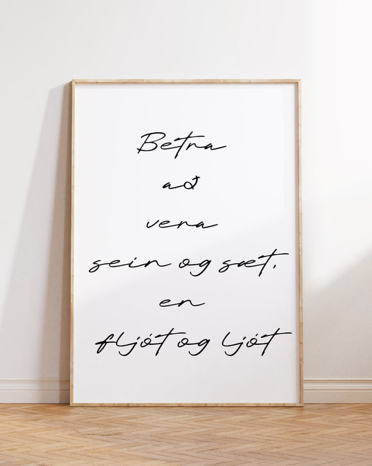 Veggspjald: Betra að vera sein og sæt, en fljót og ljót